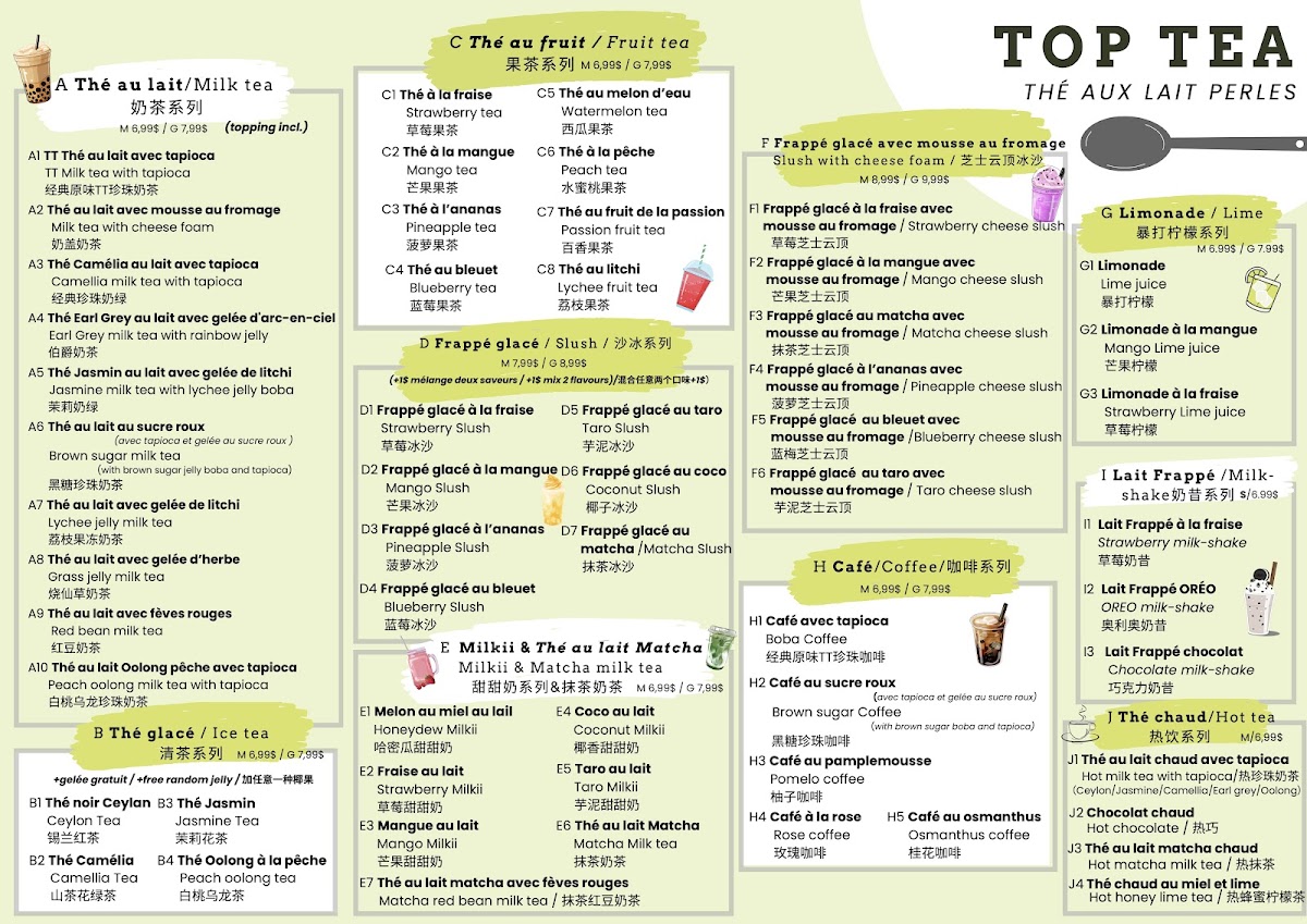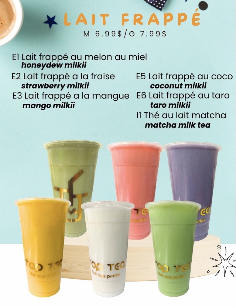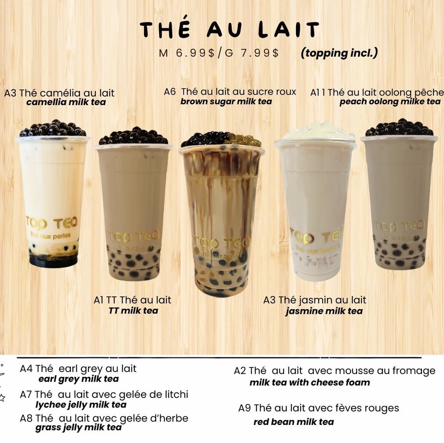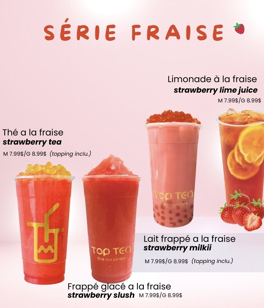 Welcome to Top Tea, a delightful bubble tea haven located at 2746 Saint-Charles Blvd in Kirkland, Quebec. This charming spot offers an exciting menu that promises to please every palate. With options like 鲜肉包 dumplings for CA$7.99 and an array of fruity drinks, including Thé À La Fraise and luscious strawberry slush, it's a paradise for bubble tea enthusiasts.